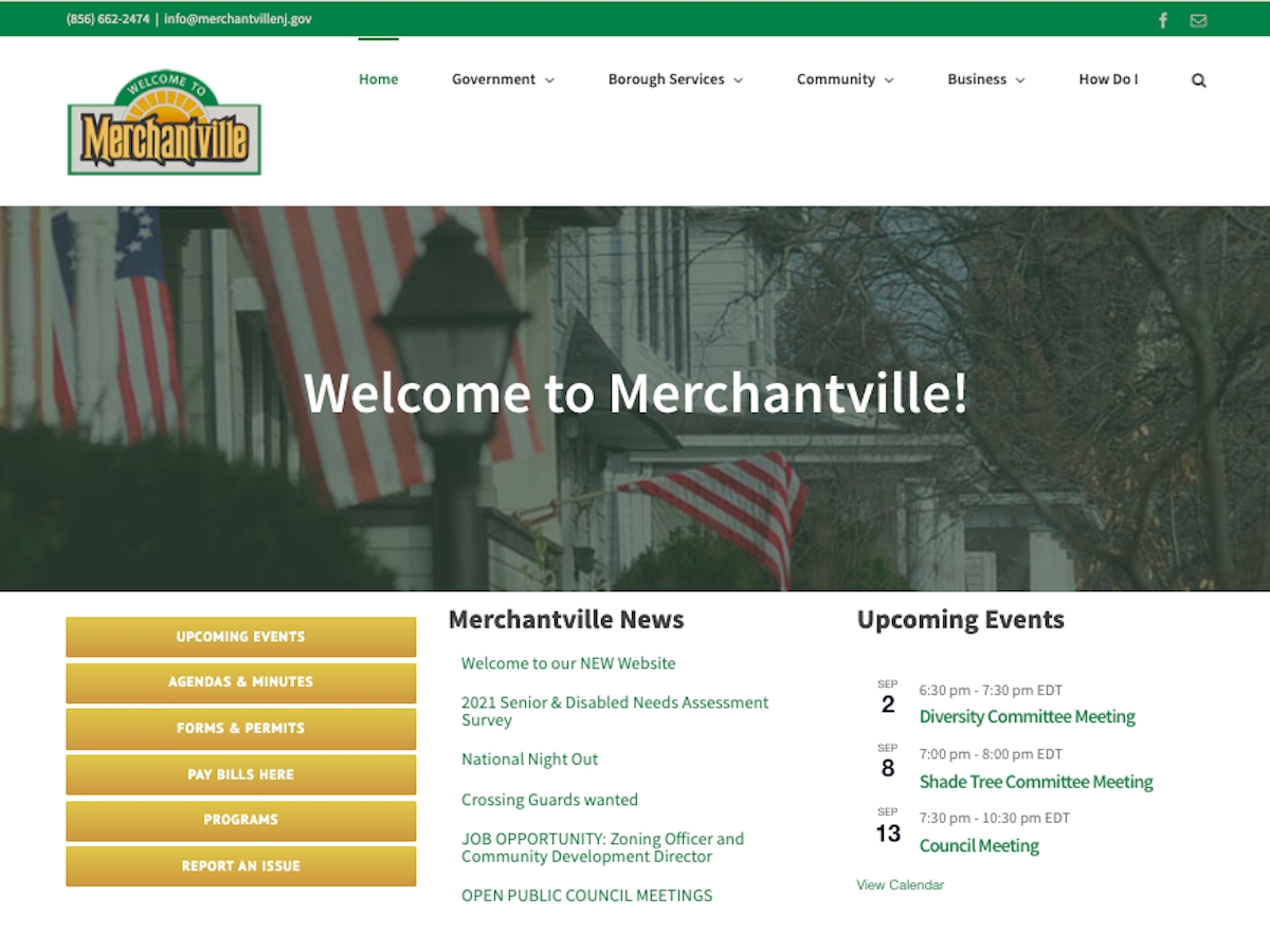 On August 27th the Borough of Merchantville launched its new website. So, when you logon to www.merchantvillenj.gov - the official municipal website of Merchantville Borough - you will notice a lot of changes. News Center, Upcoming Events and a photo slider are prominently displayed on the homepage. You'll also find easy access to forms and permits, agenda and minutes, payments, programs and a search bar on this updated site. Catch up or stay current on Council, Land Use, Shade Tree, Historic Preservation and Diversity meeting agenda and minutes. Browse through the calendar to search for monthly meetings and local events. It's still a work in progress so you may find that some links are not fully functional yet - so help out by dropping a line to This email address is being protected from spambots. You need JavaScript enabled to view it. if you spot a problem or connection error. Thanks!