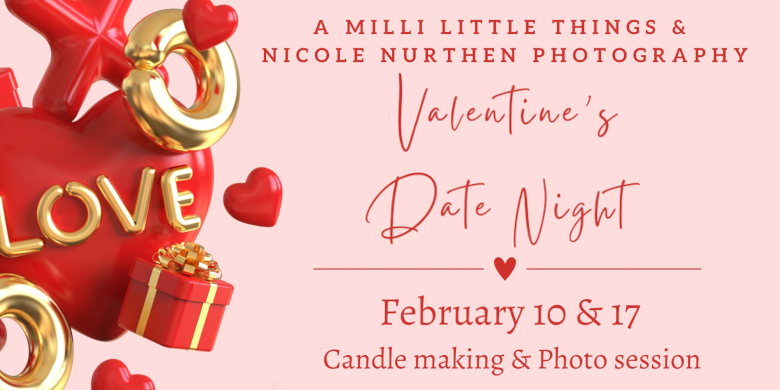 A Milli Little Things and Nicole Nurthen Photography are collaborating on back-to-back weekends in February to bring you a fun-filled Valentine's Date Night! Join us for an unforgettable evening on Saturday, February 10th or 17th when you can craft a candle of your choice and scent in a decorative container then just stroll a block away to enjoy a mini-photo shoot that captures this memorable night. Light refreshments will be served. To book and secure your spot