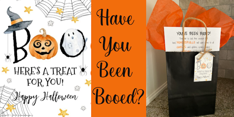 YOU’VE BEEN BOOED! The air is cool, the season fall and MONSTERVILLE will soon come to all. Ghosts and goblins, spooks galore, tricky Witches at your front door . . . Those Spooks were needing things to do. In fact, they brought this BOO to you! Please help these goblins spread some Cheer by gifting a Friend or Neighbor near. Just Grab a carrier for each one and fill it to the brim with Halloween fun. Then, Drop it off in the dark of night and see their surprise at the dawn of Light. Enclose this Poem