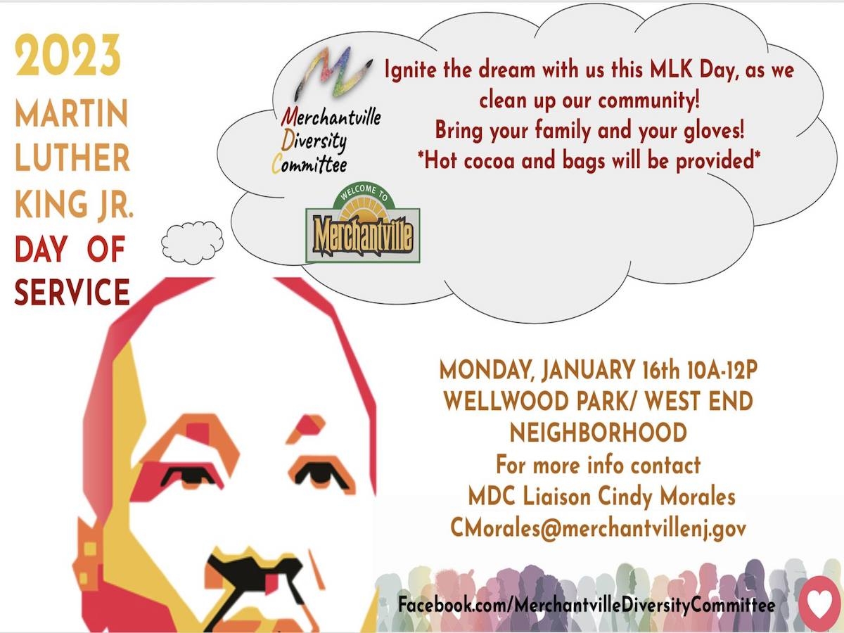 The Merchantville Diversity Committee invites you to join their efforts for a day of service on Monday, January 16th, from 10 a.m.-12 p.m. in honor of Martin Luther King Jr. Meet the team at the Wellwood Park gazebo and help to