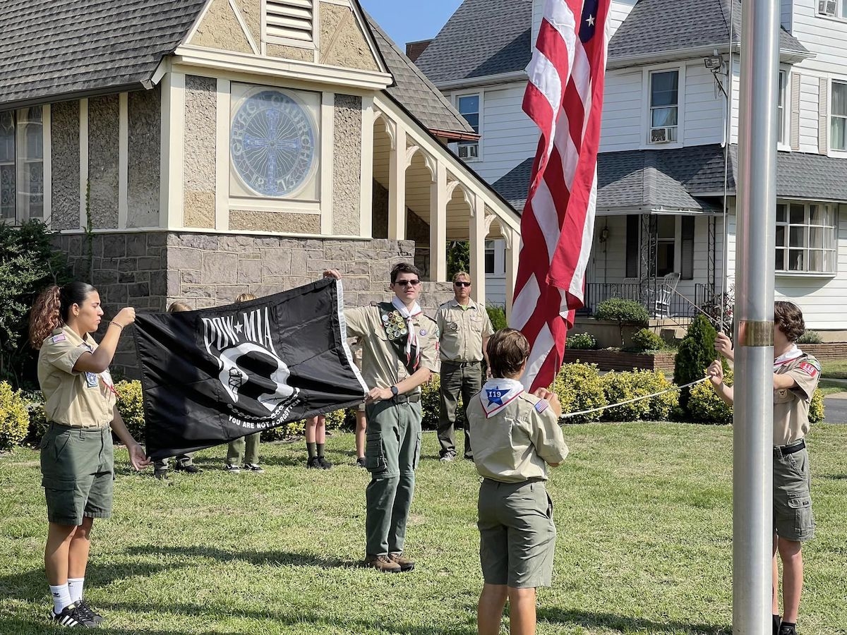 At 10:30 a.m. on Saturday, September 17th, at the POW/MIA Remembrance Service took place at Grace Episcopal Church. Members of F.W. Grigg Post 68 and Scout Troop 119 remembered the thousands of service men and women who never returned home or are still missing and scout Meredith had the honor of carrying the POW/MIA flag. This event was hosted by the Merchantville American Legion Post 68 in conjunction with the Camden County American Legion committee. During the service the flag and its meaning were explained, a missing man table service was preformed and all that attended were given an opportunity to hold the flag. Afterwards, Merchantville Scout Troop 119 installed the flag on the church's flag pole.